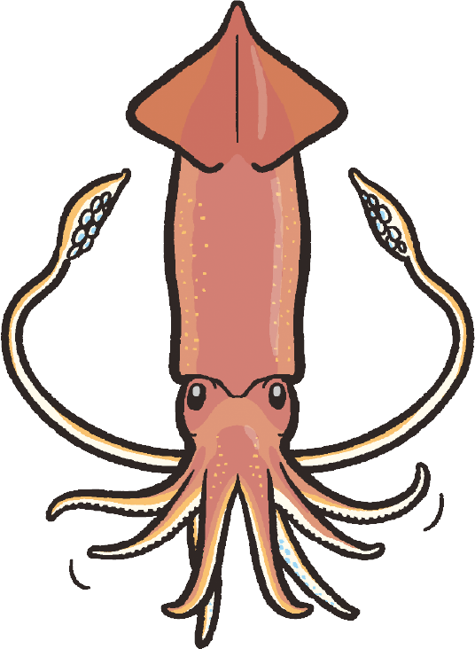 「ひれ」「エンペラ」とも言いうよ。泳およぐときに、向むきを変かえる役割やくわりがあるんだ。ちなみに、「耳みみ」がついているところが体からだで、頭あたまから足あしがはえているんだ!