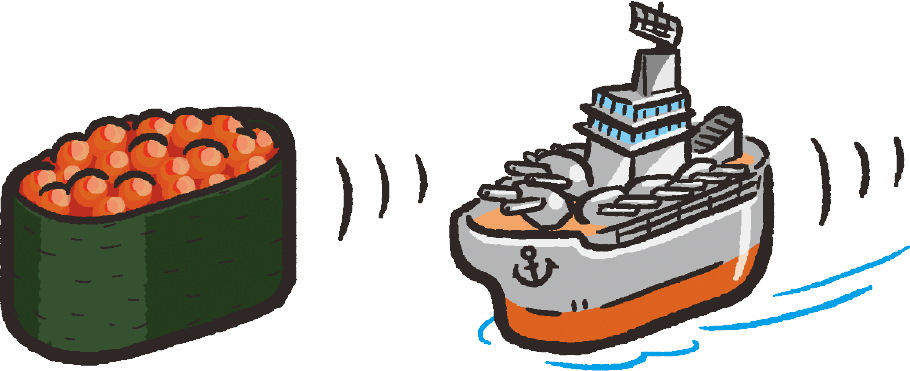 すしめしのまわりをのりでまいて、その上うえにいくらやうになどの具ぐをのせるおすしを「ぐんかんまき」と言いうよ。いろんなものをのせて、スイスイと進すすむ船ふねみたいでしょ?