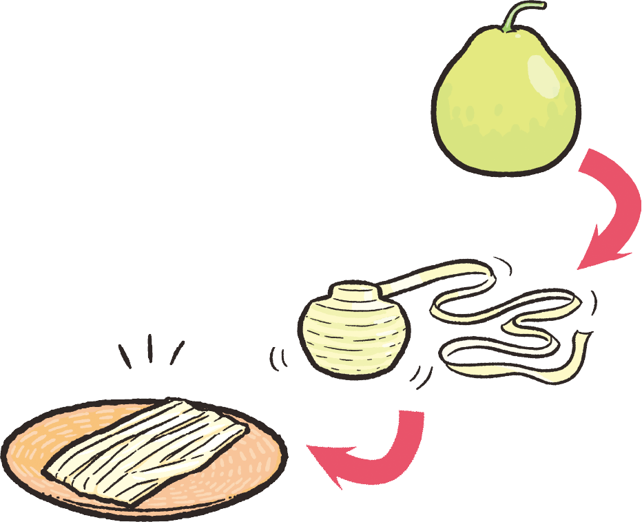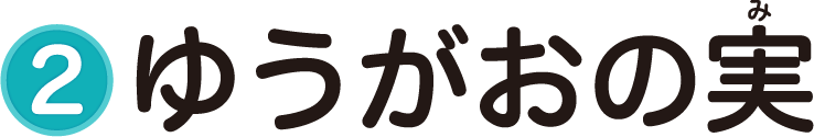 ゆうがおは、きゅうりなどと同おなじ「うり」の仲なか間まで、60cm~90cmもの大おおきな実みができるよ。この実みを細長ほそなが~くけずって、かわかしたものが「かんぴょう」だよ!