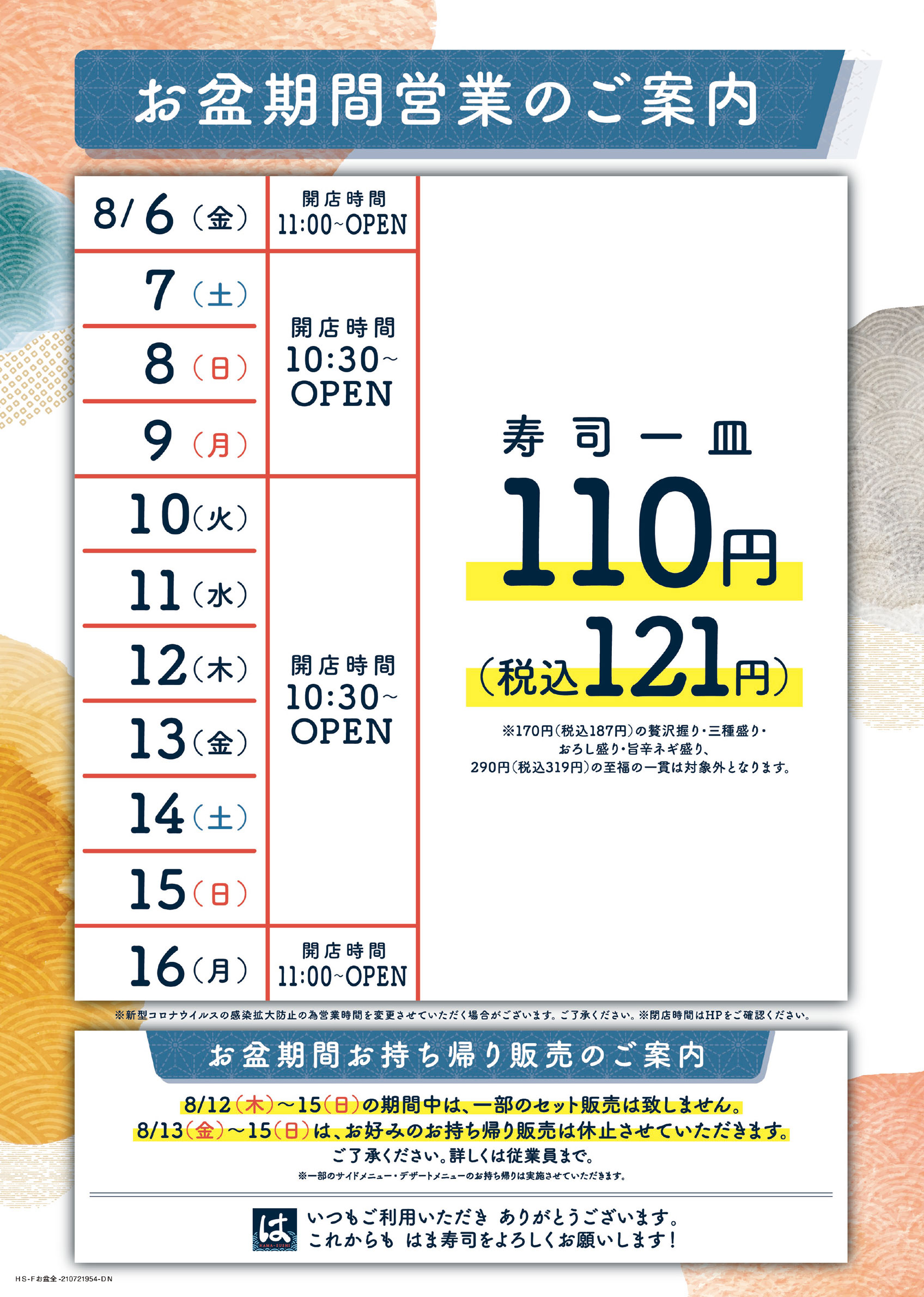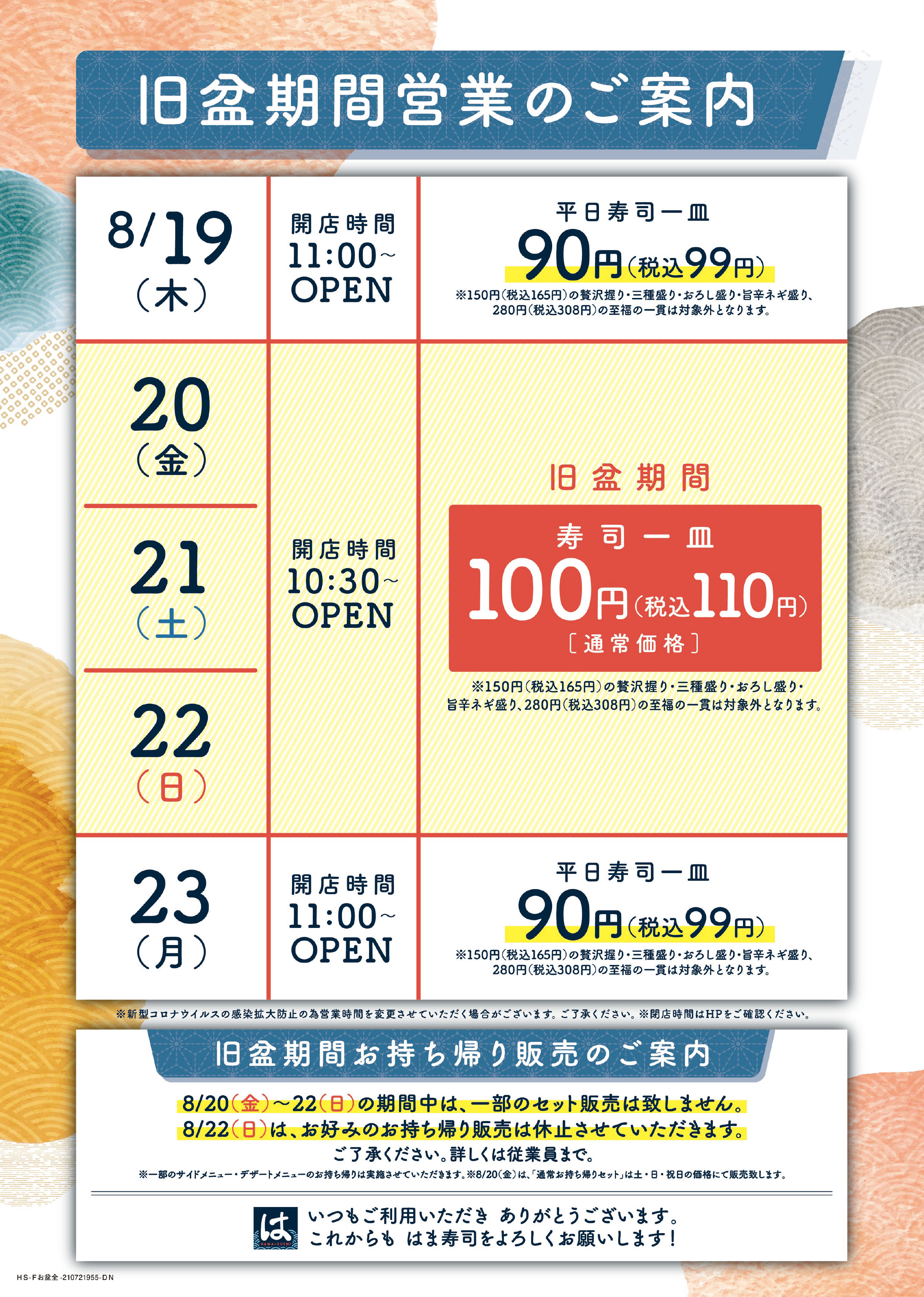 ※平日90円(税込99円)キャンペーン実施店舗は、8/6(金)・8/16(月)はお寿司一皿税込99円でご提供いたします。